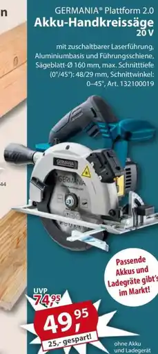 | 1 | GERMANIA Plattform 2.0 Akku-Handkreissäge 20V | Sonderpreis Baumarkt | €74,95 | €49,95 | €25,00 Rabatt | 18 April 2026 | 24 April 2026 | Angebot anschauen | |