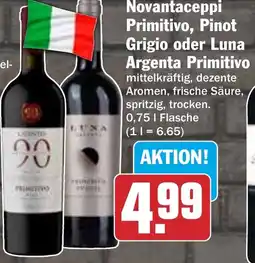 | 1 | Novantaceppi Primitivo, Pinot Grigio oder Luna Argenta Primitivo 0.75 l | HIT | €4,99 | 22 Dezember 2025 | 27 Dezember 2025 | Angebot anschauen | |||