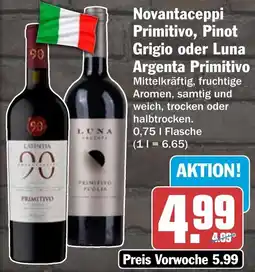 | 2 | Novantaceppi Primitivo, Pinot Grigio oder Luna Argenta Primitivo 0.75 l | HIT | €5,99 | €4,99 | €1,00 Rabatt | 09 März 2026 | 14 März 2026 | Angebot anschauen | |
