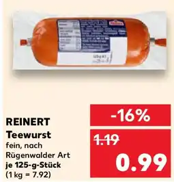 | 1 | REINERT Teewurst 125 g | Kaufland | €1,18 | €0,99 | -16% | 23 April 2026 | 29 April 2026 | Angebot anschauen | |