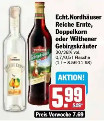 Jetzt im Angebot bei AEZ: Echt.Nordhäuser Reiche Ernte, Doppelkorn oder Wilthener Gebirgskräuter ✅ Aktion gültig vom 5-01 bis 10-01.