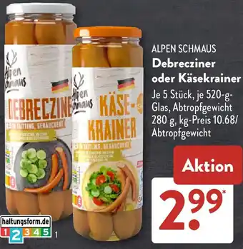 Jetzt im Angebot bei Aldi Süd: ALPEN SCHMAUS Debrecziner oder Käsekrainer ✅ Aktion gültig vom 5-01 bis 11-01.