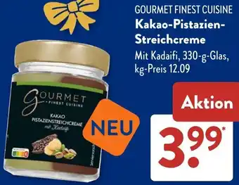Jetzt im Angebot bei Aldi Süd: GOURMET FINEST CUISINE Kakao-Pistazien Streichcreme ✅ Aktion gültig vom 22-12 bis 28-12.