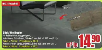 für Fußbodenheizung geeignet, Holz-Dekor: Eiche Trend, Stärke: 3 mm, 240 x 1.220 mm (B x L) Paket 2,63 m² Preis/Paket = 39.19 Fliesen-Dekor: Garda, Stärke: 3,5 mm, 305 x 610 mm (B x L) Paket 1,86 m² Preis/Paket = 27.71