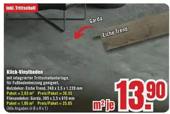 mit integrierter Trittschallunterlage, für Fußbodenheizung geeignet, Holzdekor: Eiche Trend, 240 x 3,5 x 1.220 mm Paket = 2,63 m² Preis/Paket = 36.55 Fliesendekor: Garda, 305 x 3,5 x 610 mm Paket = 1,86 m² Preis/Paket = 25.85 (Alle Angaben in B x H x T)