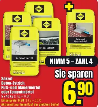 Sakret Beton-Estrich, Putz- und Mauermörtel oder Zementmörtel Aktion bei B1 Discount Baumarkt
