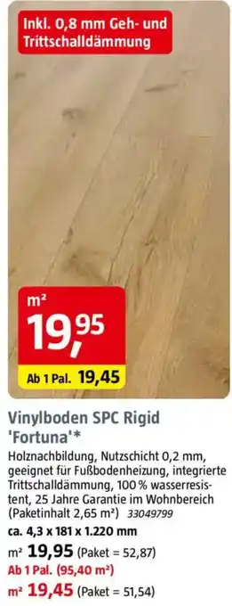 Den Preis von dem Vinylboden SPC Rigid 'Fortuna' finden Sie auch oben auf der Website, zusammen mit dem Datum, ab wann das Angebot erhältlich ist. Sie können die Preise auch im aktuellen Bauhaus Prospekt nachhalten oder auf der Bauhaus Website nachschauen. Durch die Angebote können Sie sicher sein, die Bauhaus Produkte zum absoluten Bestpreis zu ergattern.