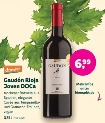 Den Preis von dem Gaudón Rioja Joven DOCa finden Sie auch oben auf der Website, zusammen mit dem Datum, ab wann das Angebot erhältlich ist. Sie können die Preise auch im aktuellen Biomarkt Prospekt nachhalten oder auf der Biomarkt Website nachschauen. Durch die Angebote können Sie sicher sein, die Biomarkt Produkte zum absoluten Bestpreis zu ergattern.