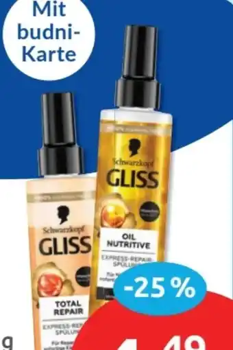 Jetzt im Angebot bei Budni: Schwarzkopf Gliss Express Sprüh-Spülung ✅ Aktion gültig vom 2-03 bis 8-03.