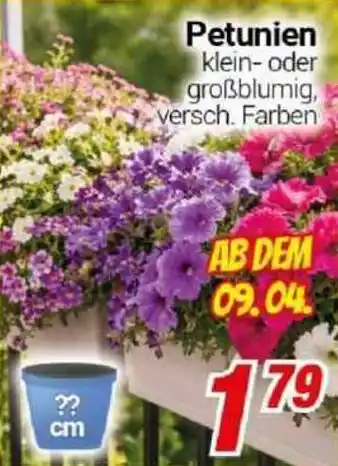 Diese Woche ist Petunien bei CENTERSHOP reduziert erhältlich. Hier finden Sie alle Informationen zu Preisen, Aktionsdetails und Laufzeit. Prüfen Sie weitere Petunien Aktionen, um sicherzugehen, dass Sie den besten Preis erhalten. Die Petunien Aktion gilt in Kalenderwoche 15. Nach Ablauf zeigen wir Ihnen vergleichbare Alternativen. Abonnieren Sie die Kategorie, um beim nächsten Mal direkt informiert zu sein, wenn Petunien wieder reduziert ist.Häufig gestellte Fragen über Petunien