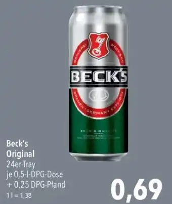 Den Preis von dem Beck's Original finden Sie auch oben auf der Website, zusammen mit dem Datum, ab wann das Angebot erhältlich ist. Sie können die Preise auch im aktuellen CITTI Markt Prospekt nachhalten oder auf der CITTI Markt Website nachschauen. Durch die Angebote können Sie sicher sein, die CITTI Markt Produkte zum absoluten Bestpreis zu ergattern.