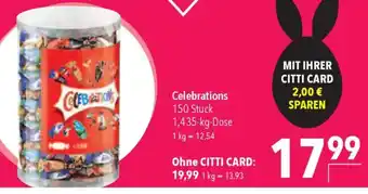 Den Preis von dem Celebrations finden Sie auch oben auf der Website, zusammen mit dem Datum, ab wann das Angebot erhältlich ist. Sie können die Preise auch im aktuellen CITTI Markt Prospekt nachhalten oder auf der CITTI Markt Website nachschauen. Durch die Angebote können Sie sicher sein, die CITTI Markt Produkte zum absoluten Bestpreis zu ergattern.