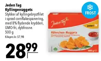 Stykker af kyllingebrystfilet i sprød cornflakespanering, med 8% flydende krydder, Jeden Tags GMO-fri, dybfrosne. 500 g Kilopris kr. 57,98