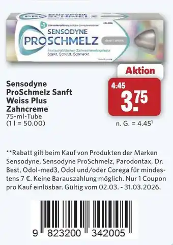 Jetzt im Angebot bei Combi: Sensodyne proschmelz sanft weiss plus zahncreme ✅ Aktion gültig vom 2-03 bis 7-03.
