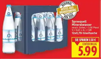 Den Preis von dem Spreequell Mineralwasser finden Sie auch oben auf der Website, zusammen mit dem Datum, ab wann das Angebot erhältlich ist. Sie können die Preise auch im aktuellen E-Center Prospekt nachhalten oder auf der E-Center Website nachschauen. Durch die Angebote können Sie sicher sein, die E-Center Produkte zum absoluten Bestpreis zu ergattern.