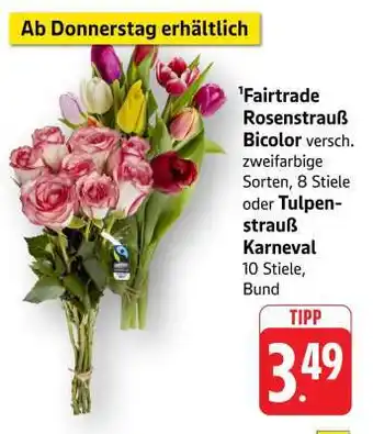 Fairtrade Rosenstrauß Bicolor oder Tulpenstrauß Karneval-Angebot bei Edeka