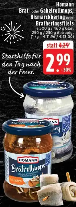 Homann Brat- oder Gabelrollmops, Bismarckhering oder Bratheringsfilets Aktion bei Edeka