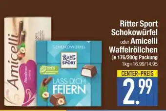 Ritter Sport Schokowürfel oder Amicelli Waffelröllchen-Rabatt bei Edeka