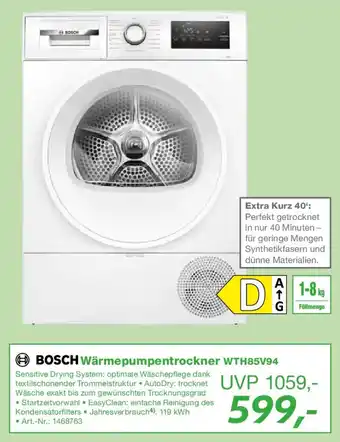 Jetzt im Angebot bei EP: BOSCH Wärmepumpentrockner WTH85V94 ✅ Aktion gültig vom 27-02 bis 15-03.