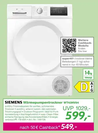 SIEMENS Wärmepumpentrockner WT43HV94-Angebot bei EP