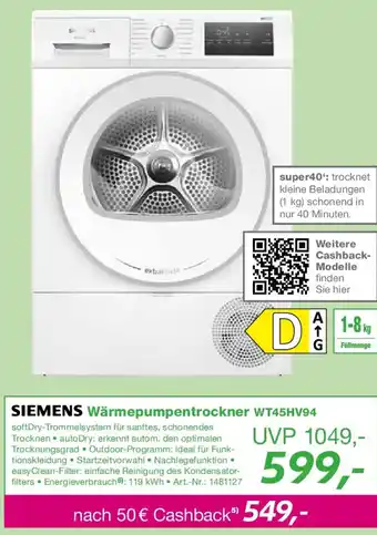 SIEMENS Wärmepumpentrockner WT45HV94-Rabatt bei EP