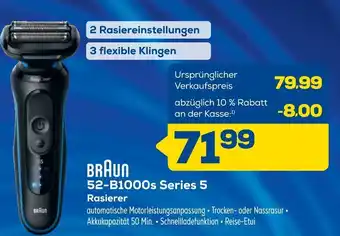 Den Preis von dem BRAUN 52-B1000s Series 5 Rasierer finden Sie auch oben auf der Website, zusammen mit dem Datum, ab wann das Angebot erhältlich ist. Sie können die Preise auch im aktuellen Euronics Prospekt nachhalten oder auf der Euronics Website nachschauen. Durch die Angebote können Sie sicher sein, die Euronics Produkte zum absoluten Bestpreis zu ergattern.