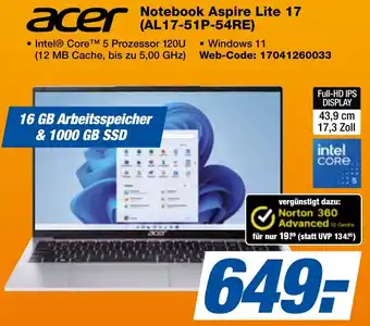 Jetzt im Angebot bei expert Techno Land: acer Notebook Aspire Lite 17 (AL17-51P-54RE) ✅ Aktion gültig vom 5-02 bis 12-02.