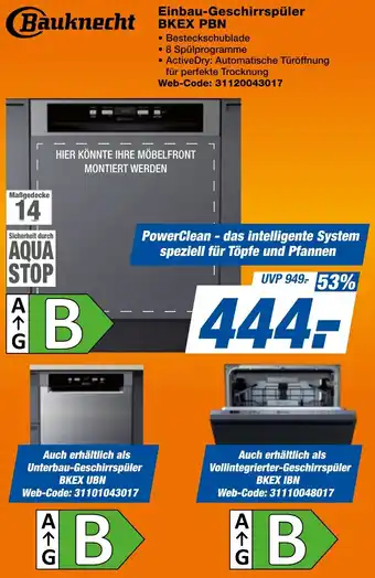 Bauknecht Einbau-Geschirrspüler BKEX PBN ist jetzt im Angebot bei expert Techno Land, gültig vom 27-02-2026 bis 05-03-2026. Besuchen Sie die Website von expert Techno Land oder kaufen Sie Bauknecht Einbau-Geschirrspüler BKEX PBN direkt im Geschäft. Auf Prospektangebote.de finden Sie immer die besten aktuellen Aktionen. Vergleichen Sie Bauknecht Einbau-Geschirrspüler BKEX PBN mit anderen Angeboten und prüfen Sie, ob sich ein Kauf jetzt lohnt. Behalten Sie kommende Aktionen im Blick, denn manche Produkte sind nur nächste Woche oder nur vor Ort verfügbar.Häufig gestellte Fragen über Bauknecht Einbau-Geschirrspüler BKEX PBN