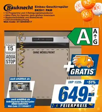 Bauknecht Einbau-Geschirrspüler BKSV1 PAM ist jetzt im Angebot bei expert Techno Land, gültig vom 24-04-2026 bis 30-04-2026. Besuchen Sie die Website von expert Techno Land oder kaufen Sie Bauknecht Einbau-Geschirrspüler BKSV1 PAM direkt im Geschäft. Auf Prospektangebote.de finden Sie immer die besten aktuellen Aktionen. Vergleichen Sie Bauknecht Einbau-Geschirrspüler BKSV1 PAM mit anderen Angeboten und prüfen Sie, ob sich ein Kauf jetzt lohnt. Behalten Sie kommende Aktionen im Blick, denn manche Produkte sind nur nächste Woche oder nur vor Ort verfügbar.Häufig gestellte Fragen über Bauknecht Einbau-Geschirrspüler BKSV1 PAM