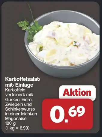Kartoffeln verfeinert mit Gurken, Eiern, Zwiebeln und Schinkenwurst in einer leichten Mayonaise 100 g (1 kg = 6.90)