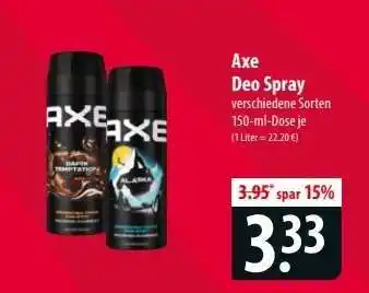 Diese Woche ist AXE Deo Spray bei Famila Nord Ost reduziert erhältlich. Hier finden Sie alle Informationen zu Preisen, Aktionsdetails und Laufzeit. Prüfen Sie weitere AXE Deo Spray Aktionen, um sicherzugehen, dass Sie den besten Preis erhalten. Die AXE Deo Spray Aktion gilt in Kalenderwoche 51. Nach Ablauf zeigen wir Ihnen vergleichbare Alternativen. Abonnieren Sie die Kategorie, um beim nächsten Mal direkt informiert zu sein, wenn AXE Deo Spray wieder reduziert ist.Häufig gestellte Fragen über AXE Deo Spray