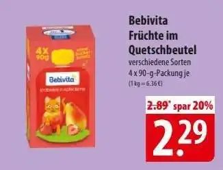 Jetzt im Angebot bei Famila Nord Ost: Bebivita Früchte im Quetschbeutel ✅ Aktion gültig vom 19-01 bis 24-01.