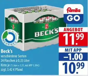 Den Preis von dem Beck's finden Sie auch oben auf der Website, zusammen mit dem Datum, ab wann das Angebot erhältlich ist. Sie können die Preise auch im aktuellen Famila Nord Ost Prospekt nachhalten oder auf der Famila Nord Ost Website nachschauen. Durch die Angebote können Sie sicher sein, die Famila Nord Ost Produkte zum absoluten Bestpreis zu ergattern.