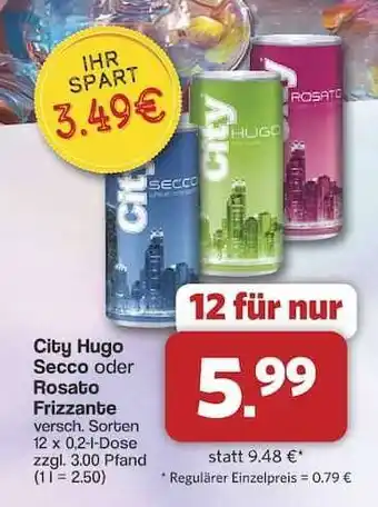 Jetzt im Angebot bei Famila Nord Ost: City Hugo Secco oder Rosato Frizzante ✅ Aktion gültig vom 9-02 bis 14-02.