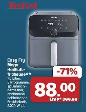 Das Angebot ist in verschiedenen Geschäften erhältlich. Schauen Sie sich alle Produkte an, um das günstigste Easy Fry Mega Heißluftfritteuse zu ergattern. Wenn Sie gerne nachschauen möchten, ob der Artikel woanders noch günstiger ist, werfen Sie einen Blick auf die Kategorie 'Supermärkte'. Möglicherweise sind diese Angebote auch interessant für Sie: Tefal Heißluftfritteuse EY501D Easy Fry & Grill XL, Tefal EY942H Dual Easy Fry XXL Heißluftfritteuse & Tefal EY942H Dual Easy Fry XXL Heißluft-Fritteuse.