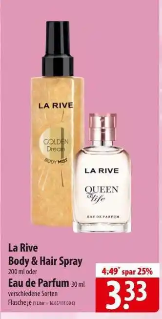 Jetzt im Angebot bei Famila Nord Ost: La Rive Body & Hair Spray oder Eau de Parfum ✅ Aktion gültig vom 29-12 bis 3-01.