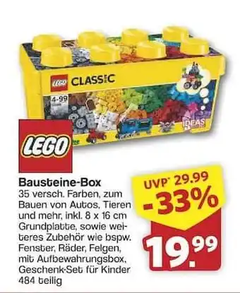 Der Lego Bausteine-Box ist jetzt mit einem Rabatt bei Famila Nord Ost erhältlich. Auf dieser Seite finden Sie alle Informationen zu den aktuellen Preisen, den Bedingungen der Aktion und der Gültigkeitsdauer des Angebots. Vergessen Sie nicht, auch die vergleichbaren Angebote und Aktionen zu Lego Bausteine-Box zu prüfen, damit Sie stets die kostengünstigste Wahl treffen können.Die Rabattaktion für Lego Bausteine-Box läuft von 02-02-2026 bis 07-02-2026. Ist die Aktion abgelaufen? Kein Problem, Sie können jederzeit andere ähnliche Angebote ansehen. Sie können auch die Produktkategorie verfolgen, um sofort informiert zu werden, sobald Lego Bausteine-Box wieder bei Famila Nord Ost im Angebot ist. Indem Sie Lego Bausteine-Box-Angebote vergleichen, können Sie immer sicherstellen, dass Sie Ihre Einkäufe zum niedrigstmöglichen Preis tätigen. Überprüfen Sie also regelmäßig unsere Website, um zu sehen, ob Lego Bausteine-Box bald erneut mit einem attraktiven Rabatt angeboten wird.