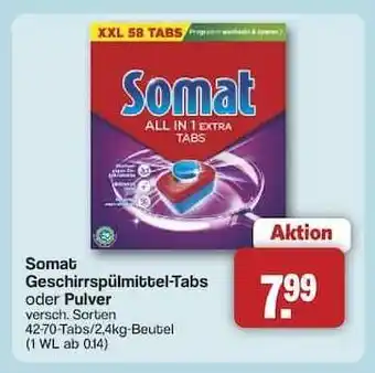 Jetzt im Angebot bei Famila Nord Ost: Somat Geschirrspülmittel-Tabs oder Pulver ✅ Aktion gültig vom 26-01 bis 31-01.