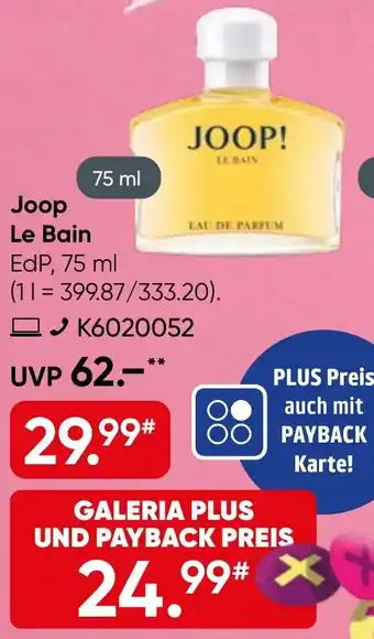Den Preis von dem Joop Le Bain EdP finden Sie auch oben auf der Website, zusammen mit dem Datum, ab wann das Angebot erhältlich ist. Sie können die Preise auch im aktuellen Galeria Prospekt nachhalten oder auf der Galeria Website nachschauen. Durch die Angebote können Sie sicher sein, die Galeria Produkte zum absoluten Bestpreis zu ergattern.