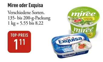 Das Angebot ist in verschiedenen Geschäften erhältlich. Schauen Sie sich alle Produkte an, um das günstigste Miree oder Exquisa zu ergattern. Wenn Sie gerne nachschauen möchten, ob der Artikel woanders noch günstiger ist, werfen Sie einen Blick auf die Kategorie 'Supermärkte'. Möglicherweise sind diese Angebote auch interessant für Sie: Miree Frischkäse, MIRÉE Frischkäsezubereitung & EXQUISA Frischkäsezubereitung.