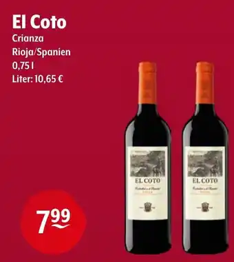 Den Preis von dem El Coto Crianza finden Sie auch oben auf der Website, zusammen mit dem Datum, ab wann das Angebot erhältlich ist. Sie können die Preise auch im aktuellen Getränke Hoffmann Prospekt nachhalten oder auf der Getränke Hoffmann Website nachschauen. Durch die Angebote können Sie sicher sein, die Getränke Hoffmann Produkte zum absoluten Bestpreis zu ergattern.
