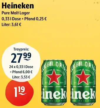 Das Angebot ist in verschiedenen Geschäften erhältlich. Schauen Sie sich alle Produkte an, um das günstigste Heineken Pure Malt Lager zu ergattern. Wenn Sie gerne nachschauen möchten, ob der Artikel woanders noch günstiger ist, werfen Sie einen Blick auf die Kategorie 'Getränkehandel'. Möglicherweise sind diese Angebote auch interessant für Sie: Heineken / 0,0%, Heineken & Heineken Pils.