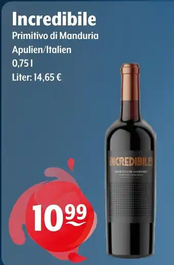 Das Angebot ist in verschiedenen Geschäften erhältlich. Schauen Sie sich alle Produkte an, um das günstigste Incredibile Primitivo di Manduria zu ergattern. Wenn Sie gerne nachschauen möchten, ob der Artikel woanders noch günstiger ist, werfen Sie einen Blick auf die Kategorie 'Getränkehandel'. Möglicherweise sind diese Angebote auch interessant für Sie: Mottura primitivo di manduria, Poggio Marù Primitivo di Manduria & Zolla Primitivo di Manduria DOC.