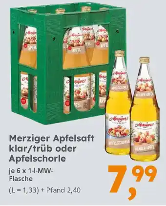 Jetzt im Angebot bei Globus Baumarkt: Merziger Apfelsaft klar/trüb oder Apfelschorle ✅ Aktion gültig vom 19-04 bis 25-04.