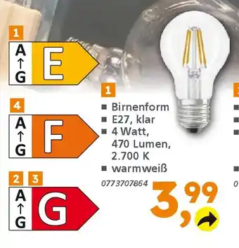 ■ Birnenform ■ E27, klar ■ 4 Watt, 470 Lumen, 2.700 K ■ warmweiß