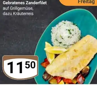 Jetzt im Angebot bei Globus: Gebratenes Zanderfilet auf Grillgemüse, dazu Kräuterreis ✅ Aktion gültig vom 12-01 bis 17-01.