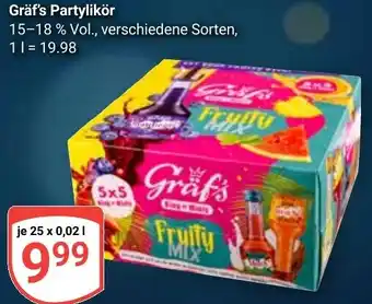 Das Angebot ist in verschiedenen Geschäften erhältlich. Schauen Sie sich alle Produkte an, um das günstigste Gräf's Partylikör zu ergattern. Wenn Sie gerne nachschauen möchten, ob der Artikel woanders noch günstiger ist, werfen Sie einen Blick auf die Kategorie 'Kaufhäuser'. Möglicherweise sind diese Angebote auch interessant für Sie: Gräf's Schnaps - Meter, Gräf's King of Minis & Angebot 3.