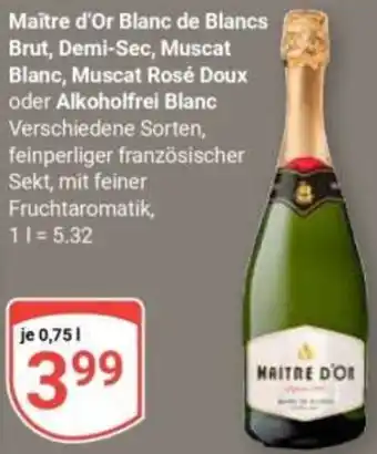 Maître d'Or Blanc de Blancs Brut, Demi-Sec, Muscat Blanc, Muscat Rosé Doux oder Alkoholfrei Blanc Aktion bei Globus