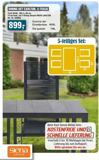 Siena GARDEN DINING-SET CARLTON, 5-TEILIG ist jetzt im Angebot bei Handelshof, gültig vom 19-03-2026 bis 24-06-2026. Besuchen Sie die Website von Handelshof oder kaufen Sie Siena GARDEN DINING-SET CARLTON, 5-TEILIG direkt im Geschäft. Auf Prospektangebote.de finden Sie immer die besten aktuellen Aktionen. Vergleichen Sie Siena GARDEN DINING-SET CARLTON, 5-TEILIG mit anderen Angeboten und prüfen Sie, ob sich ein Kauf jetzt lohnt. Behalten Sie kommende Aktionen im Blick, denn manche Produkte sind nur nächste Woche oder nur vor Ort verfügbar.Häufig gestellte Fragen über Siena GARDEN DINING-SET CARLTON, 5-TEILIG