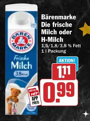 Jetzt im Angebot bei HIT: Bärenmarke Die frische Milch oder H Milch ✅ Aktion gültig vom 15-12 bis 20-12.